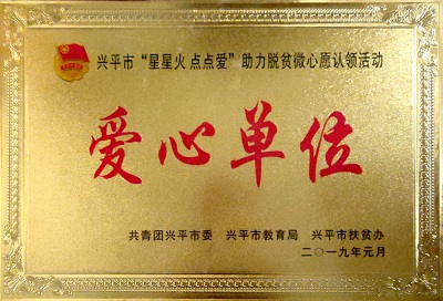 2019年1月,在興平市“星星火,點(diǎn)點(diǎn)愛”助力脫貧微心愿認(rèn)領(lǐng)活動(dòng)中,寶塔山漆被共青團(tuán)興平市委、興平市教育局、興平市扶貧辦評(píng)為“愛心單位”
