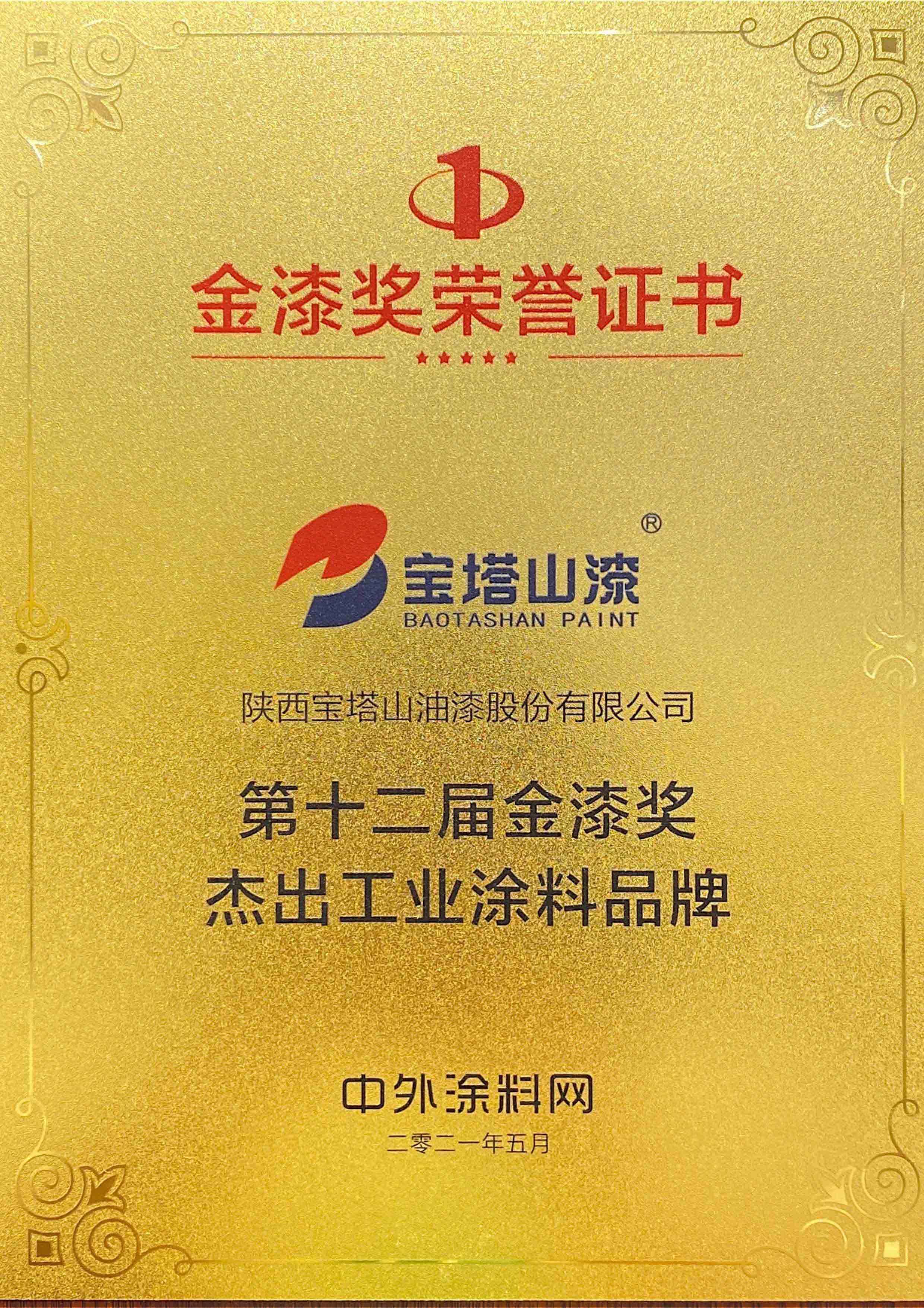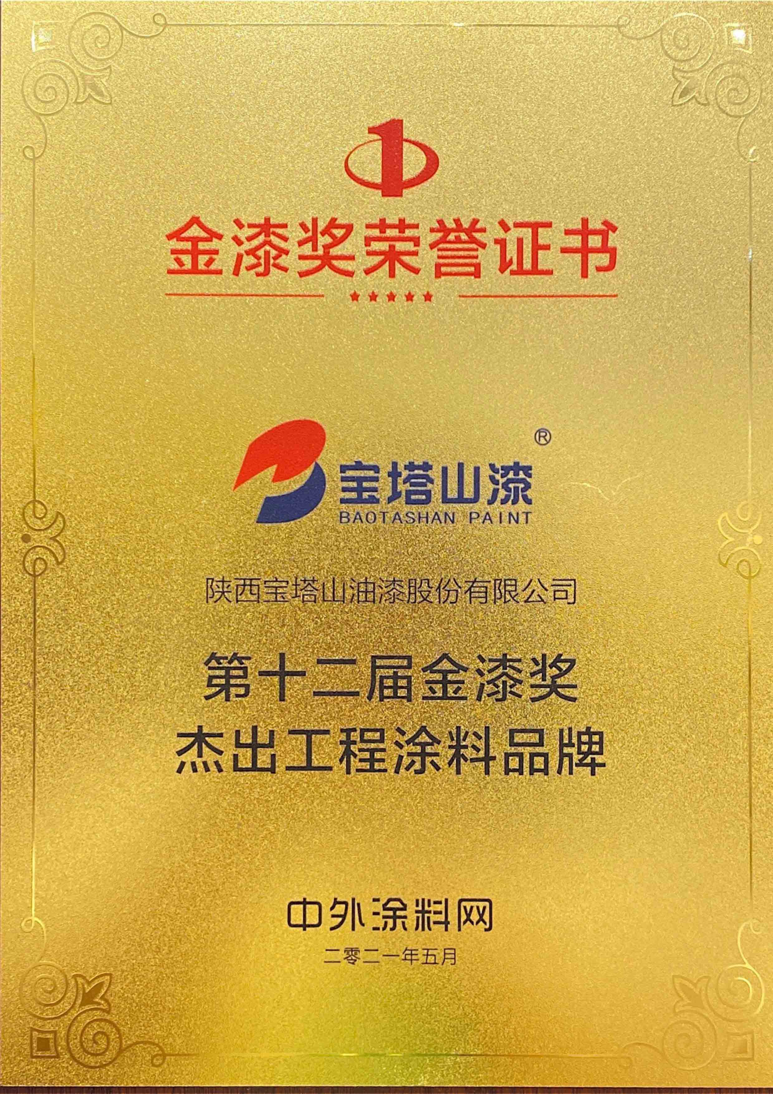 2021年5月30日,陜西寶塔山油漆股份有限公司受邀參加盛典并獲得第十二屆金漆獎(jiǎng)“杰出工程涂料品牌”