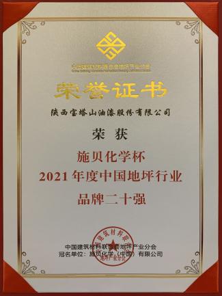 2022年3月,寶塔山漆榮獲“施貝化學(xué)杯2021年度中國(guó)地坪行業(yè)品牌二十強(qiáng)”。