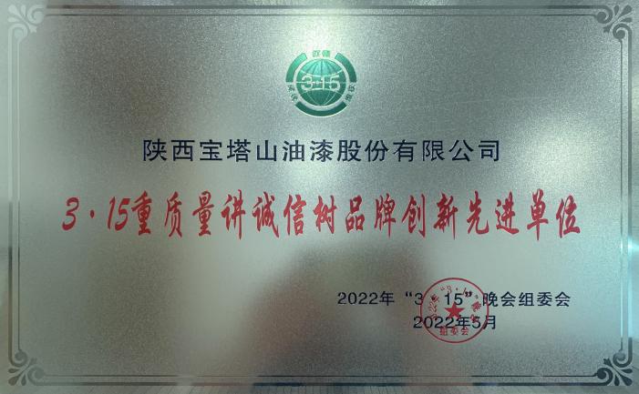 2022年5月,寶塔山漆榮獲“3·15重質(zhì)量講誠(chéng)信樹品牌創(chuàng)新先進(jìn)單位”。