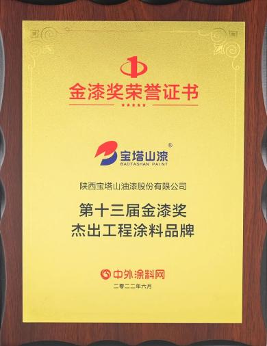 2022年6月,寶塔山漆榮獲第十三屆金漆獎(jiǎng)“杰出工程涂料品牌”。