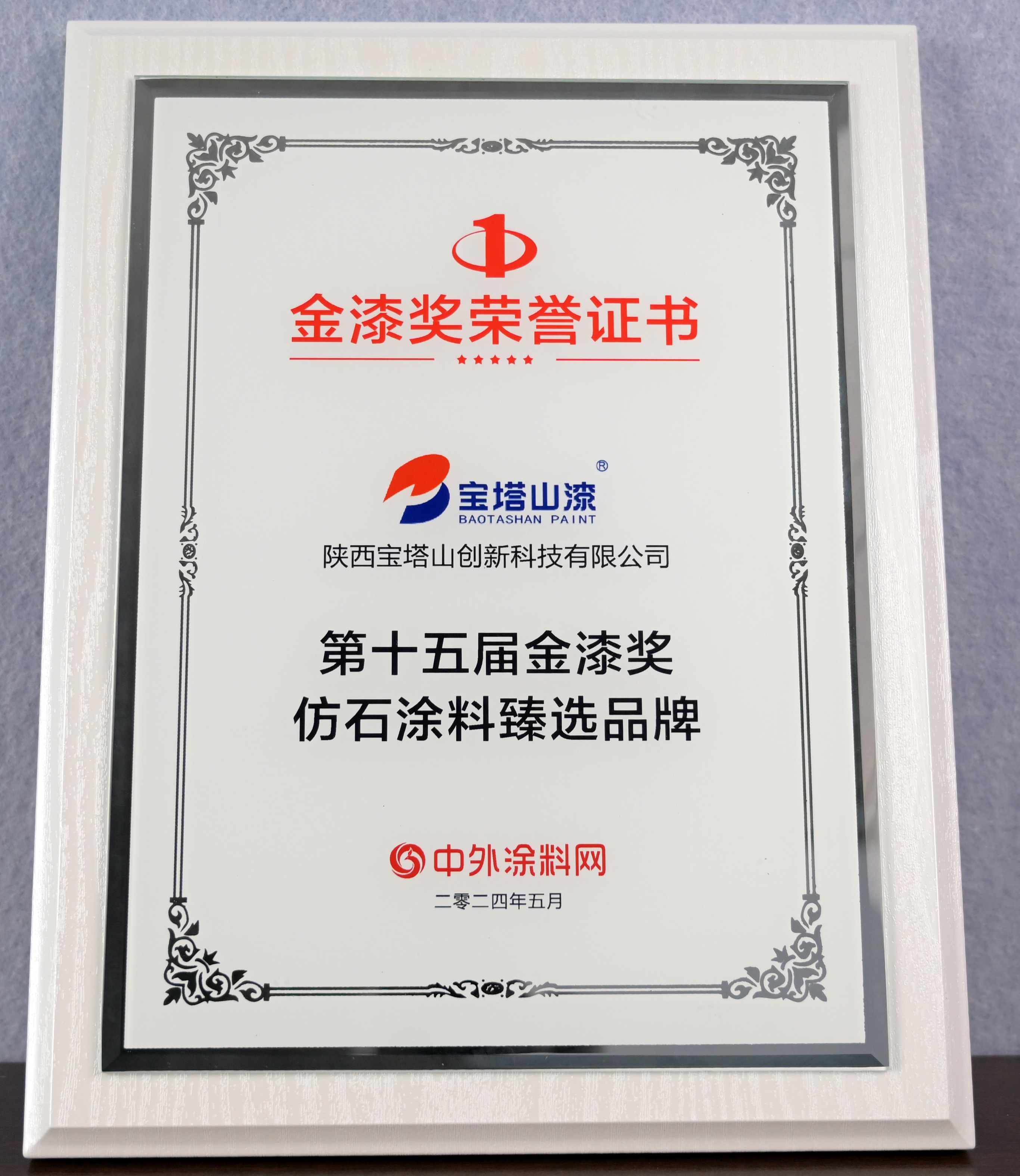 2024年5月,寶塔山漆榮獲“第十五屆金漆獎(jiǎng)仿石涂料臻選品牌”。