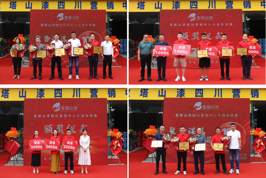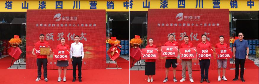 慶典現(xiàn)場先后頒發(fā)了友好商會、寶塔山漆四川旗幟、友好合作單位、優(yōu)秀銷售部、優(yōu)秀員工、銷售明星、營銷金星、營銷金牌、營銷狀元多項榮譽,表彰在十年歷程中做出卓越貢獻的單位與個人,每一個獎項都承載著對獲獎?wù)叩恼J(rèn)可與鼓勵。